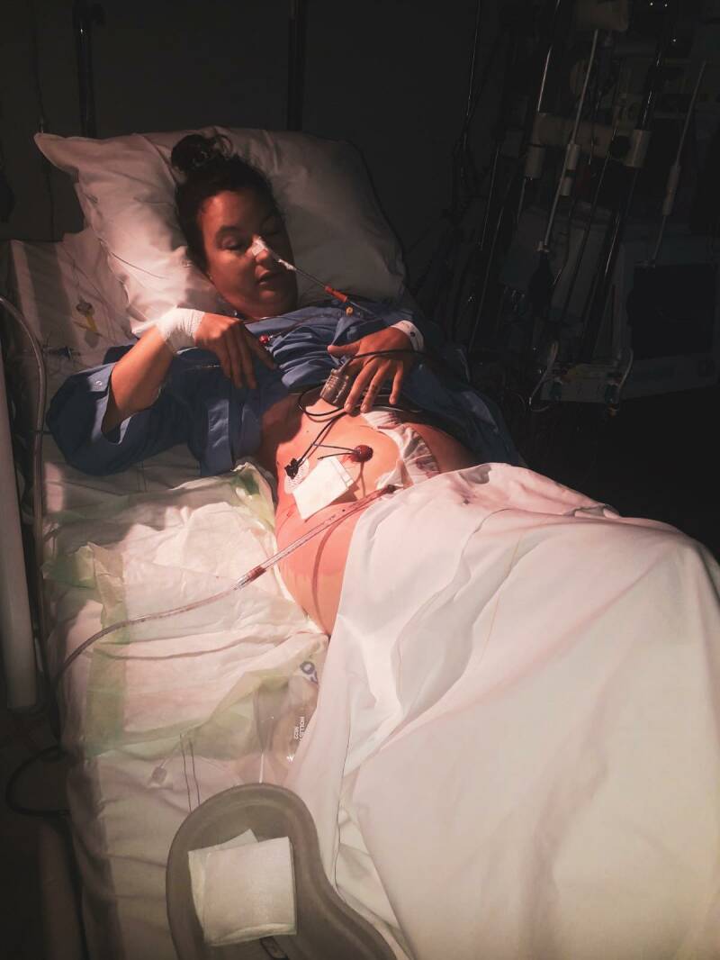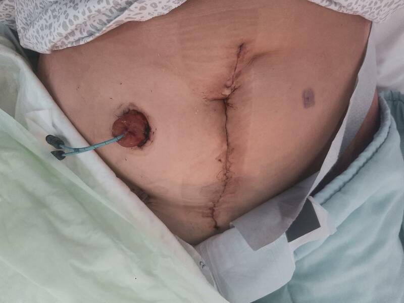 Op dat moment voelde ik me ook echt goed! Geen centje pijn. De maagsonde was hooguit een beetje irritant, het infuus in me nek vond ik niet echt prettig, voelde me net zo'n standbeeld omdat je dan toch niet vrij kunt bewegen. Ik bleek ook een wonddrain te hebben maar daar had ik geen last van eigenlijk. Na een half uur ratelen met de verpleging, mijn man en moeder werd ik toch wat moe. Zij gingen beneden wat eten zodat ik wat kon rusten. De verpleging was ook hier super lief. Ze stonden op dat moment 1 op 1, wat een luxe. Inmiddels zat ik aan de thee en de vla. Het ging steeds met 3 hapjes per half uur. Maar het bleef zitten dus we gingen de goede kant op. 's Avonds heb ik met de verpleging nog even half op de bedrand gezeten. Als ik daar nu aan terugdenk denk ik "hoe dan?". Een paar uur na je buikoperatie, hoe ben ik in hemelsnaam overeind gekomen. Maar het is gelukt héél kort en toen werd ik kotsmisselijk. Gelukkig hebben ze daar op de IC iets voor dat direct werkt, top dus! De arts kwam nog langs om te kijken hoe het met me ging. Hij was blij dat ik kon lachen en de operatie was boven verwachting goed gegaan. Maar hij waarschuwde me dat ik er niet te licht over moest denken. Ook heb ik samen met de verpleging mijn stoma bekeken. Best gek! Maar ik hoefde niet te huilen, al had ik dit wel verwacht. De splintjes moesten 4 keer per dag gespoeld worden dus ik kon er beter maar vast aan wennen. Ik heb die avond nog video gebeld en was helemaal opgelucht. Ik was bijna niet alleen en ik werd super goed verzorgd.
