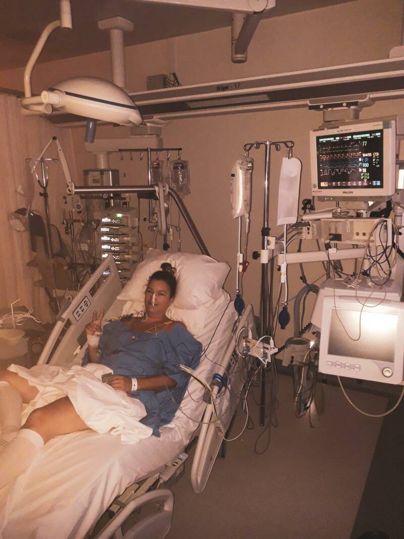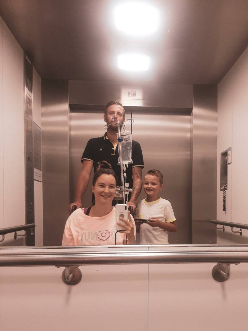 Dag 4 heb ik toch wel veel pijn gehad, wat achteraf van me darmen af bleek te komen. Het liggen in bed werd vervelend, ik voelde overal pijntjes, vooral het slapen. Op je zij slapen, zoals ik altijd doe, voelt na een buikoperatie echt niet tof. En ondertussen voelde ik me niet stabiel, niet fit genoeg om veel te wandelen. Ik was nog zo moe, door de morfine. Daarom zijn we, getipt door de gynaecoloog, met de rolstoel naar buiten gegaan. Die week was een hittegolf dus de verpleging had me gewaarschuwd. Maar ik houd juist van het warme weer, ik geniet daar zo van. Toen ik buiten de eerste zonnestraaltjes weer opving liepen de tranen over mijn wangen. Ik voelde dat ik leefde en was zo dankbaar. Ik voelde mij een winnaar, ondanks alles...